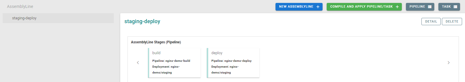 前項で定義したPipeline/Taskを用いて、AssemblyLineのマニフェストを作成します。 AssemblyLineでは、複数のPipelineをステージとして登録でき、各ステージごとにデリバリするApplicationとデリバリ先のDeploymentをそれぞれ1つ指定できます。これにより、複数のApplicationを複数のDeploymentにデリバリする処理を1つにまとめたデリバリパイプラインを構成できます。