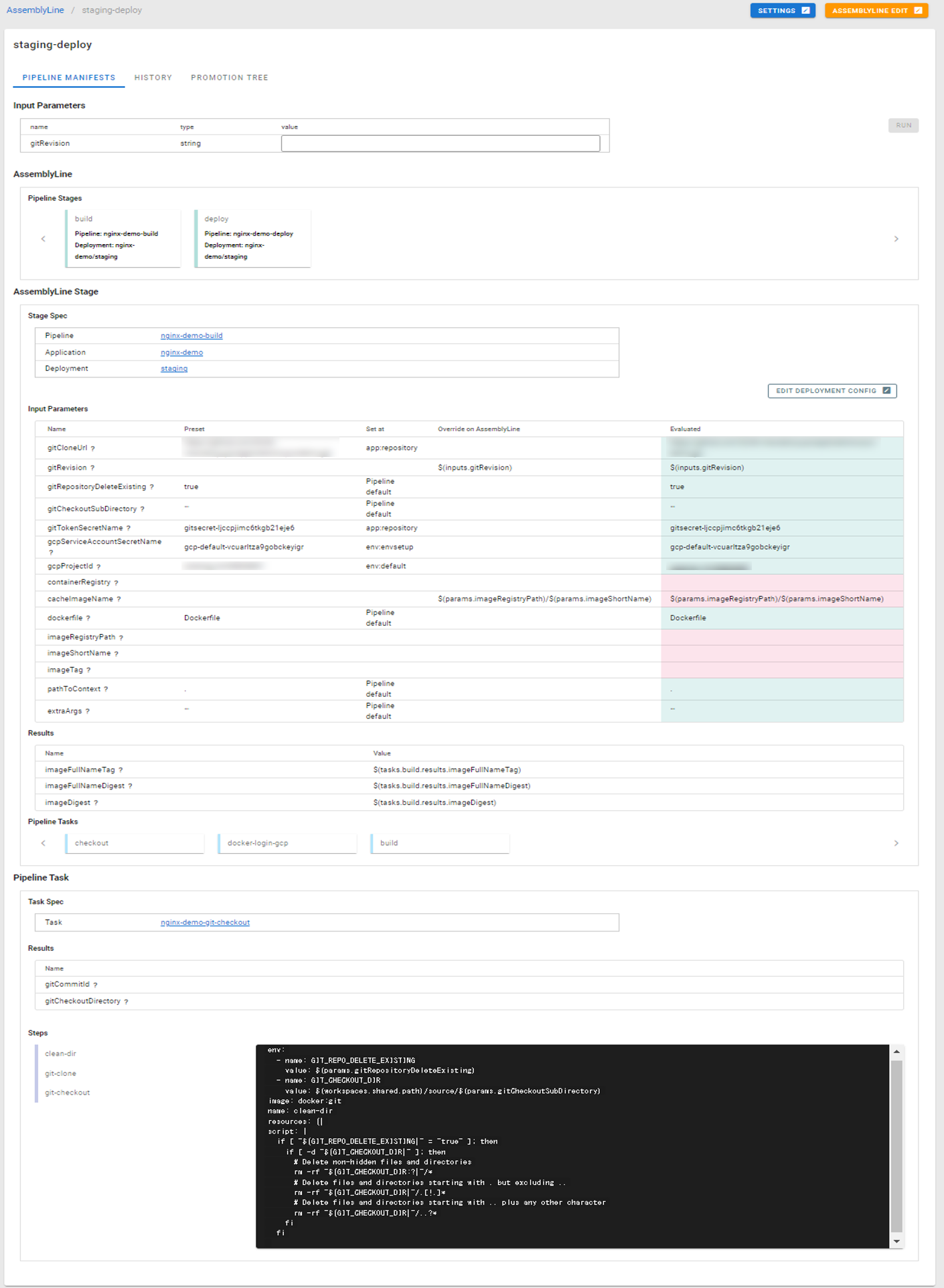 PIPELINE MANIFESTSのtabで、AssemblyLineのStageを選択することでPipelineの詳細を、PipelineTaskを選択することでTaskの詳細をそれぞれ閲覧できることを確認します。