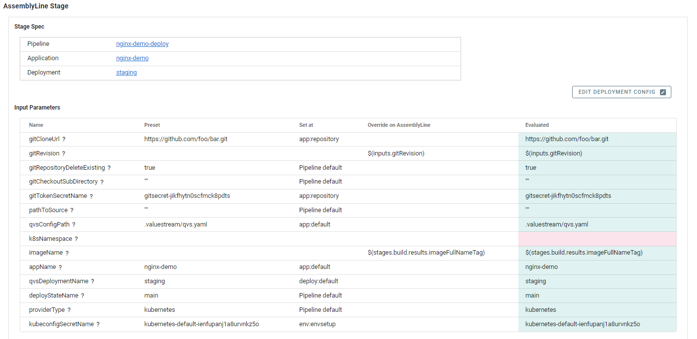 Qmonus Value Streamでは、Repository や Provisioning Targetなど、Deploymentに関連する各種リソースにおいて設定した値を 全て Deployment Params として参照でき、AssemblyLineからパイプラインステージを実行する際の引数として 利用できます。 加えて、 Deployment Config に設定することで、任意のパラメータを追加して拡張できます。