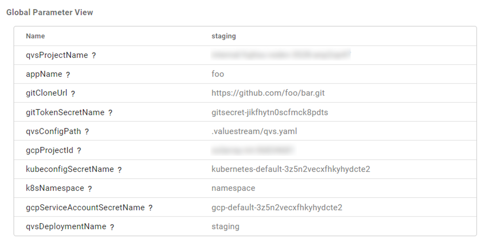 - パイプラインステージで実行されるPipelineの引数一覧と、各引数に対して注入される Deployment Params の値が表示されます。 表示される項目は以下のとおりです。