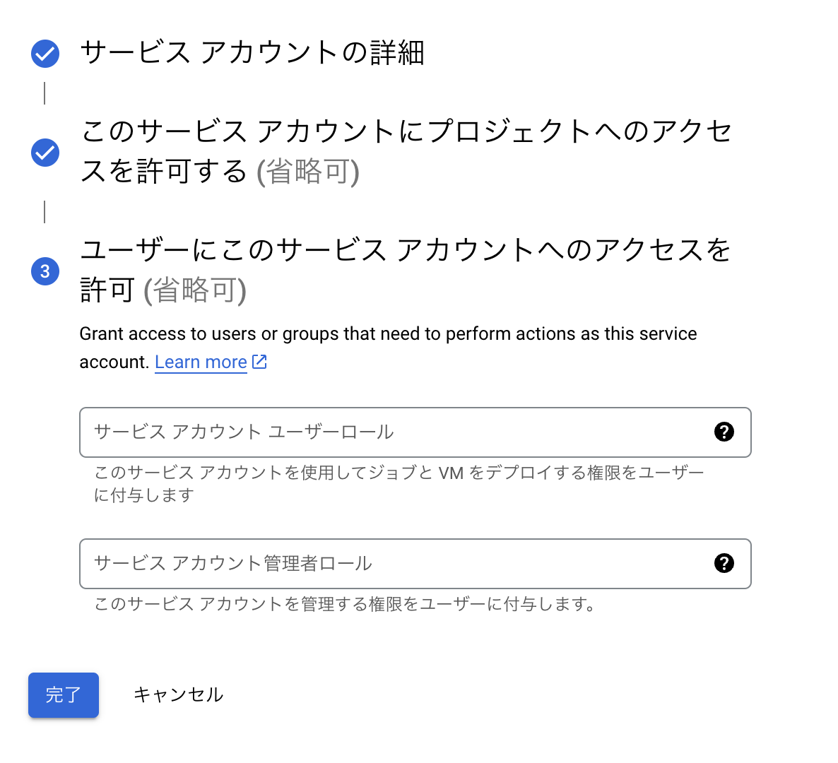 完了ボタンをクリックしてサービスアカウントの設定を完了します。