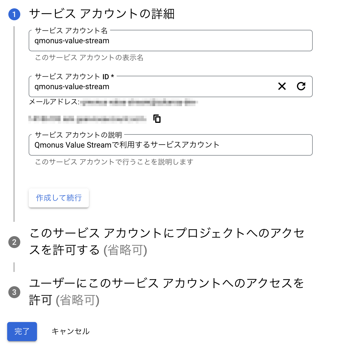 - サービスアカウント名、サービスアカウントID、サービスアカウントの説明を入力し、