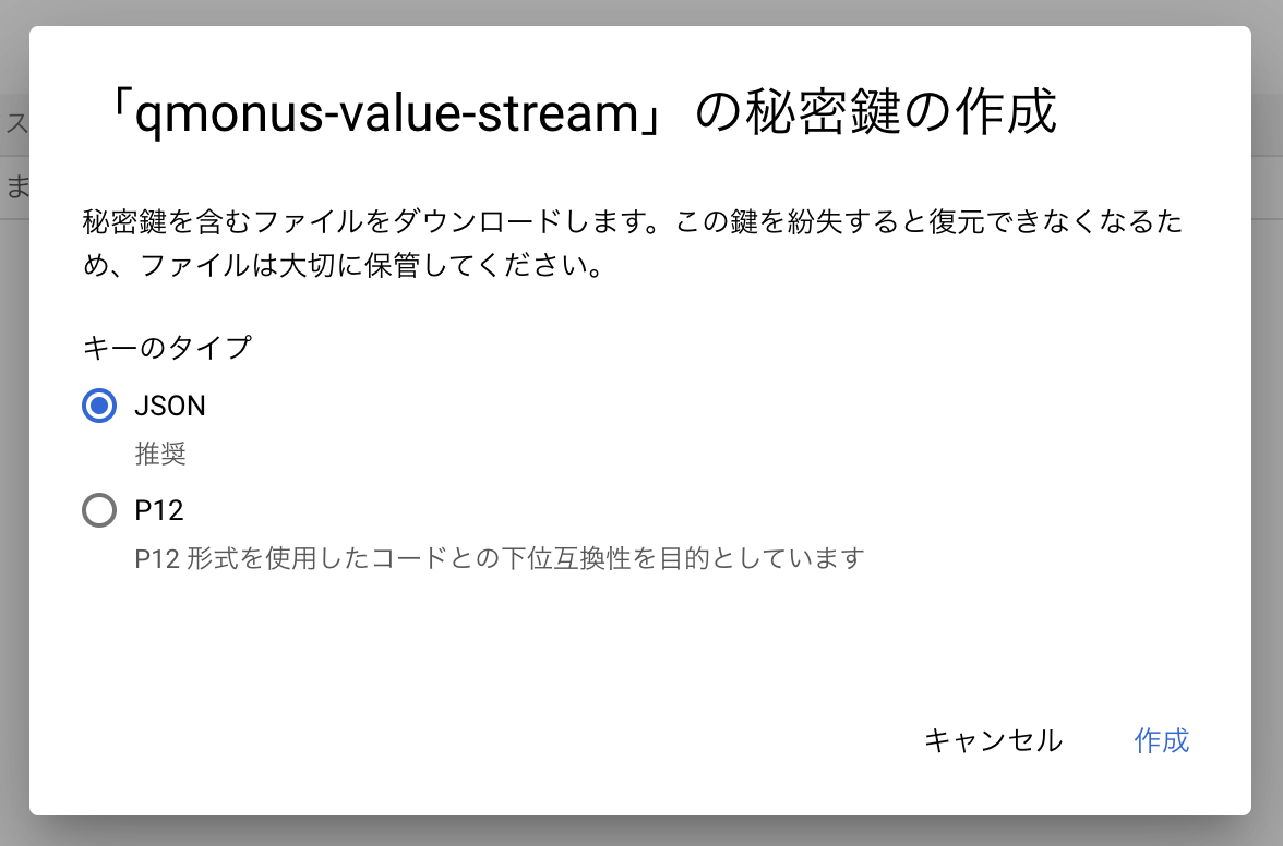 - 秘密鍵の作成が完了すると秘密鍵が記載されたJSONファイルがダウンロードされます。