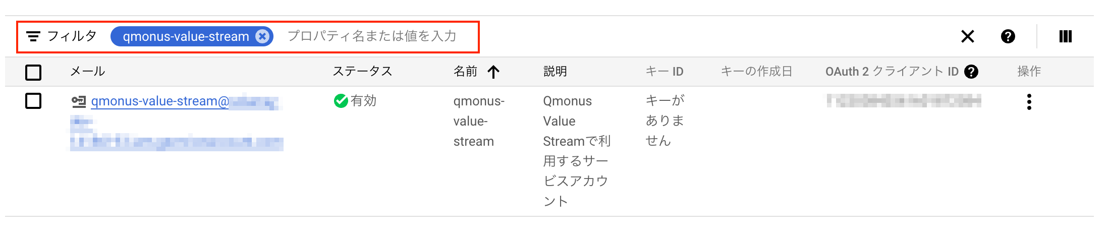 - サービスカウントの一覧画面のフィルターに、手順1で入力したサービスアカウント名を入力します。