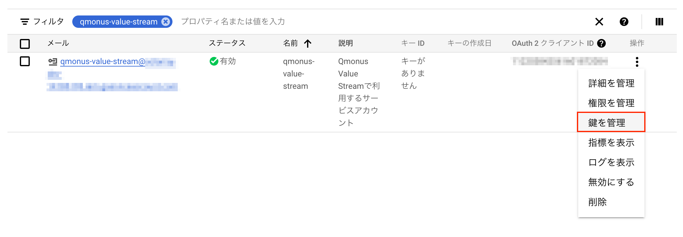 サービスアカウントの作成と権限の付与が完了したらサービスアカウントのシークレットキーを確認します。