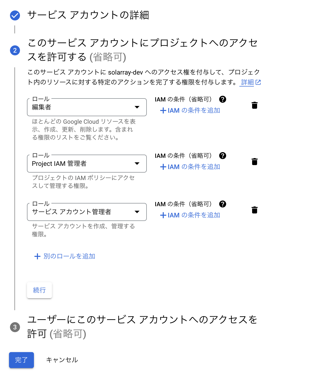 続けてサービスアカウントへの権限の付与します。