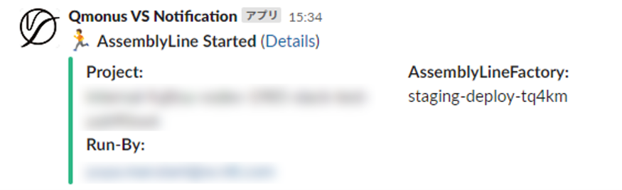 Detailsを押下すると Qmonus Value Stream の画面に遷移し、AssemblyLineの状態を確認できます。 また、通知の内容は以下になります。