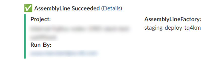 AssemblyLineを実行すると、Incoming Webhook URL発行時に指定したチャンネルに以下のような通知が投稿されます。