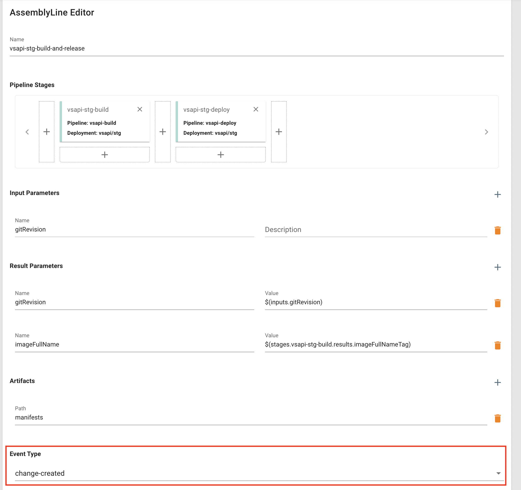 AssemblyLine Manifestへのevent-type Annotationの追加については上記のように直接Manifestを編集していただくか、もしくは、下図のようにAssemblyLine Editorから設定していただくことも可能です。