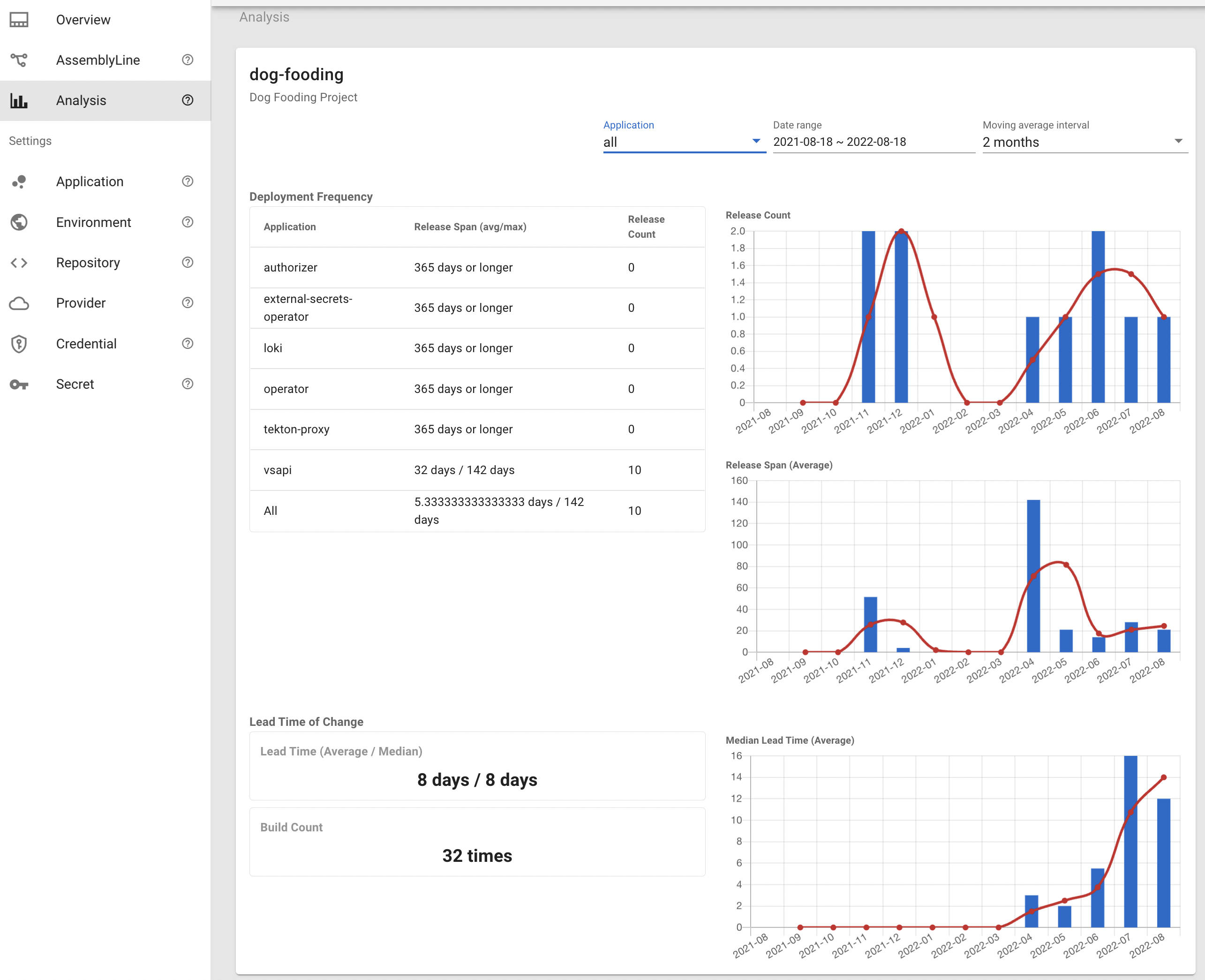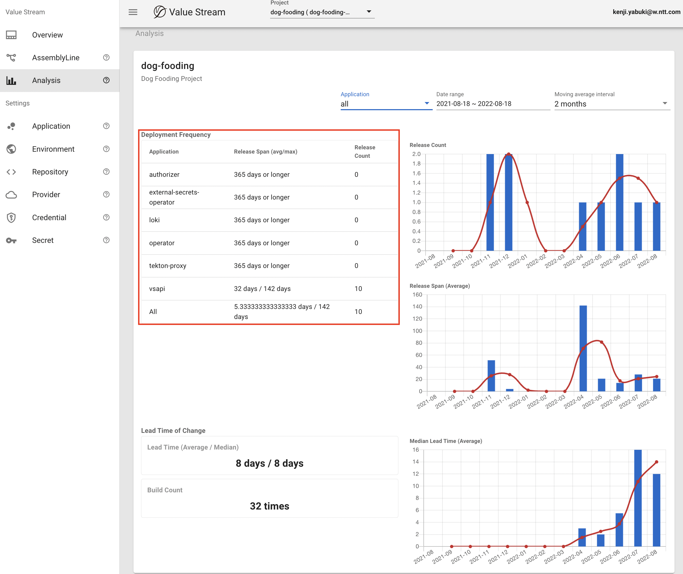 Analysis画面では、Qmonus Value Streamが収集するDevOpsメトリクスを可視化し、リリース頻度やリードタイムを分析する機能を提供しています。