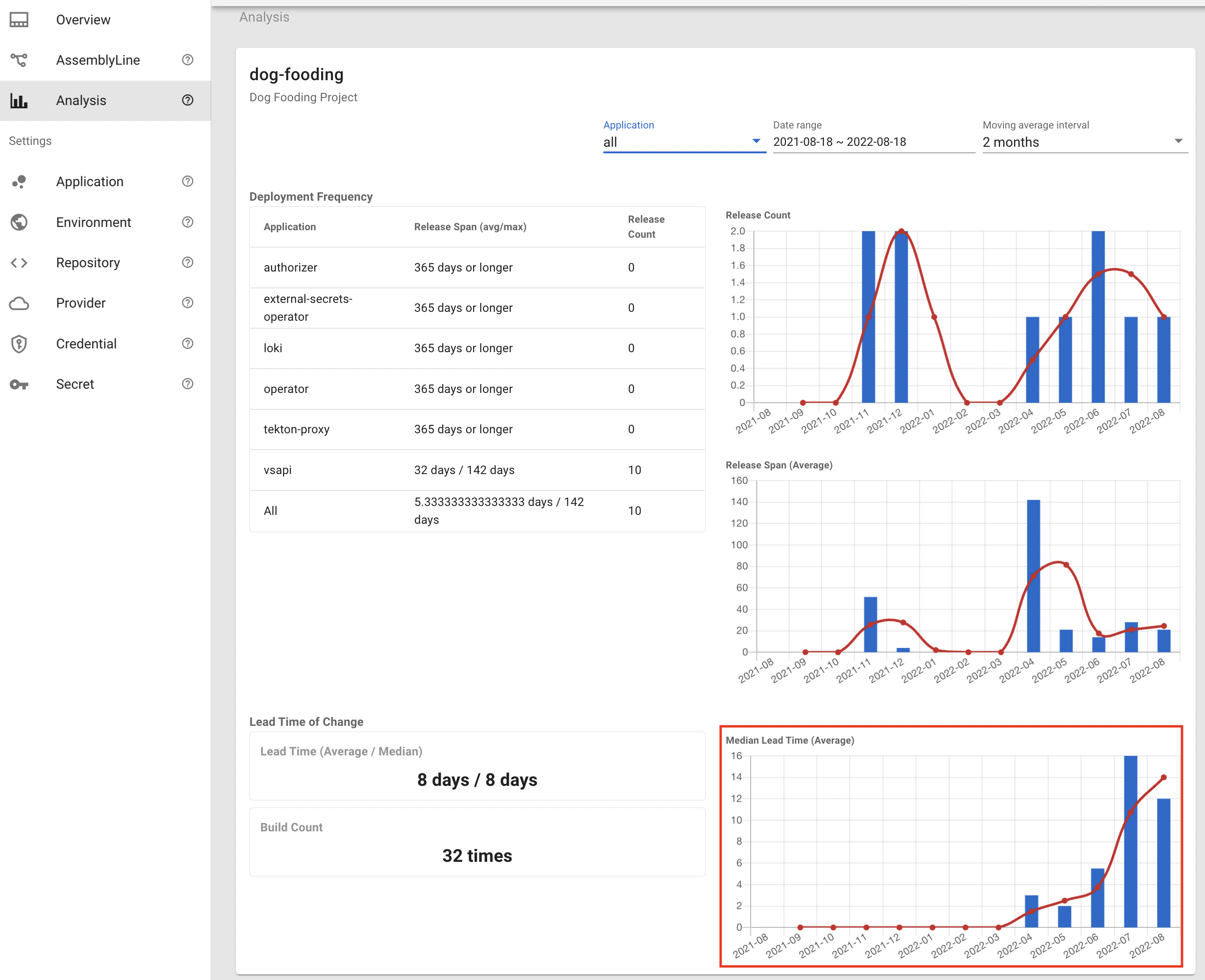指定期間における対象アプリケーションのLead Timeを月毎に移動平均とともに描画しています。