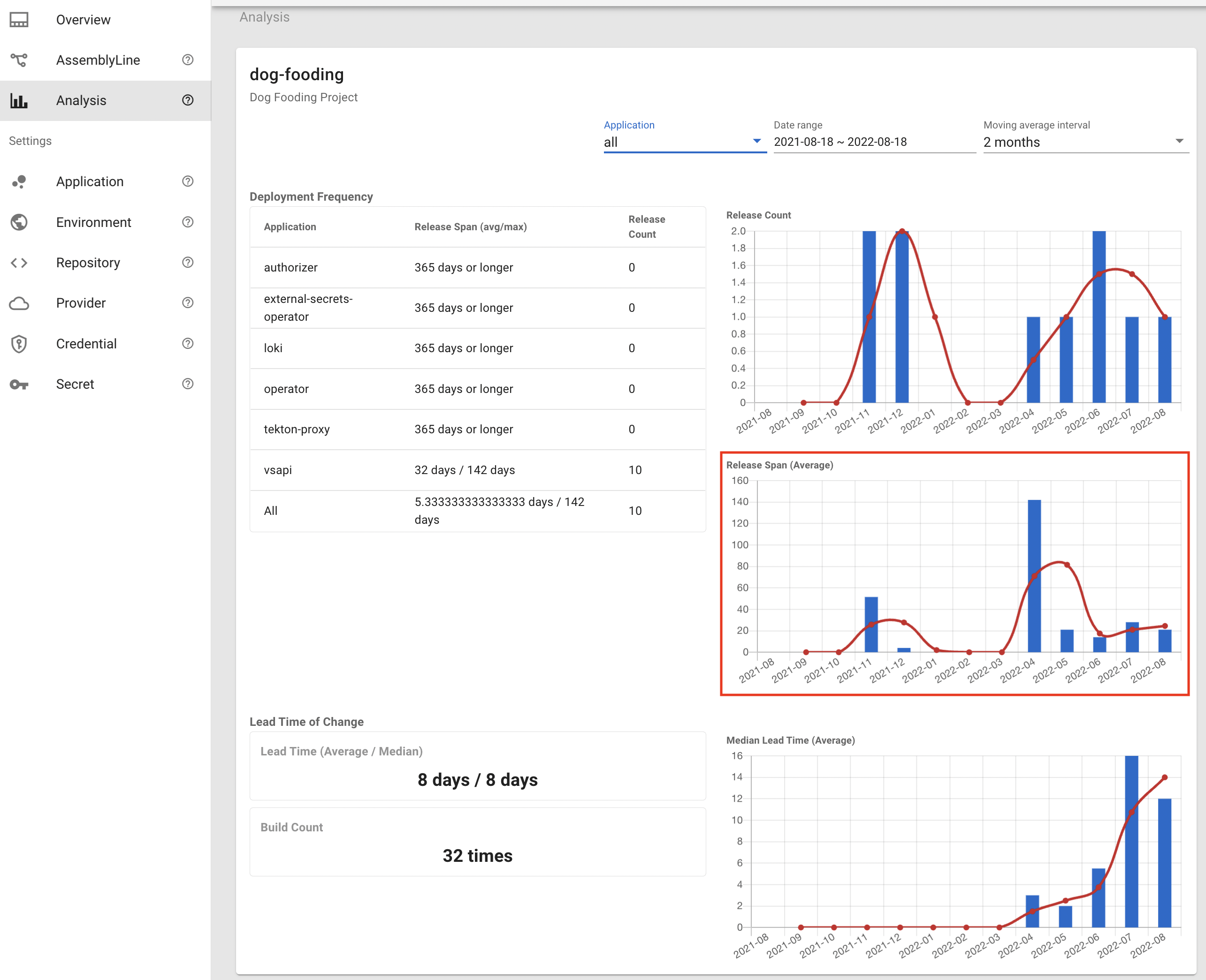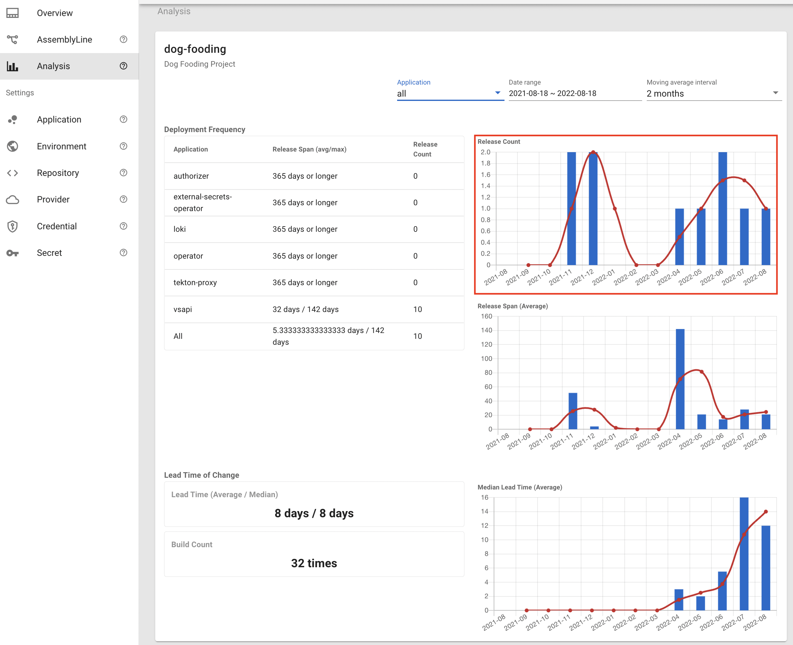 指定期間における対象アプリケーションの商用環境へのリリース間隔を月毎に移動平均とともに描画しています。