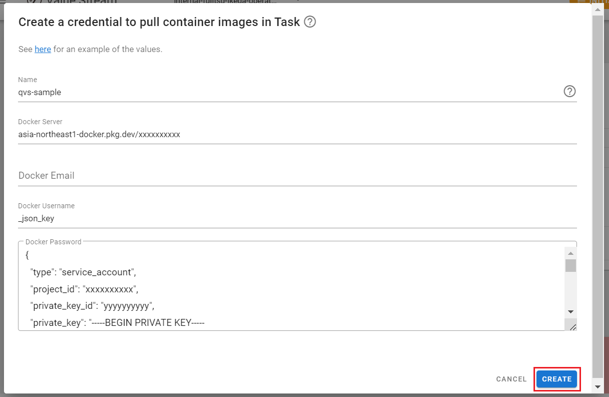 - プライベートレジストリに接続するための認証情報を登録します。例では、GCP Artifact Registryへアクセスするためのサービスアカウントjsonキーを登録しています。