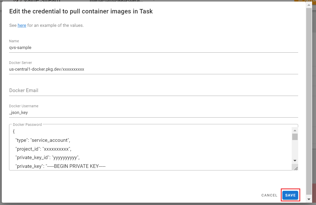 Docker Server、Docker Email、Docker UserName、Docker Passwordを変更できます。いずれの場合の変更においても、Docker Passwordは必須の入力となります。例では、Docker Serverで指定するArtifact Registryのリージョンを変更しています。 SAVEボタンを押下します。