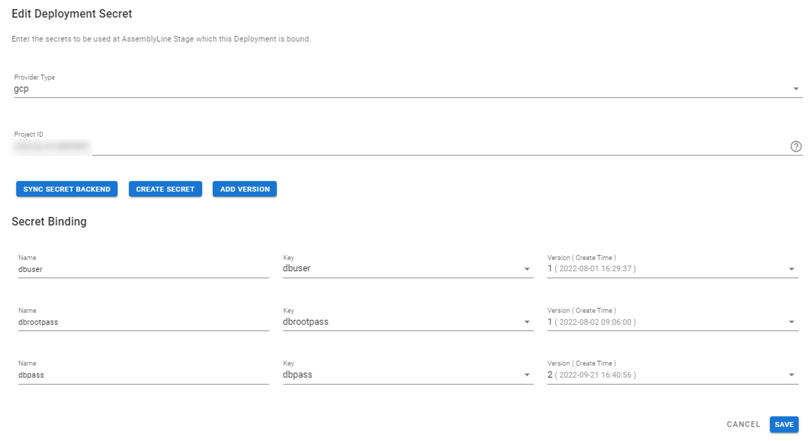 Qmonus Value Streamでは、Deployment Secret編集画面を通して各アプリケーションで利用する機密情報を、ユーザが利用する機密情報の管理サービス (e.g. GCPのSecret Manager, AzureのKey Vault, etc.)に保存できます。 そして、その登録した機密情報の名前をAssemblyLineからのパイプラインステージを実行する際の引数として利用できます。