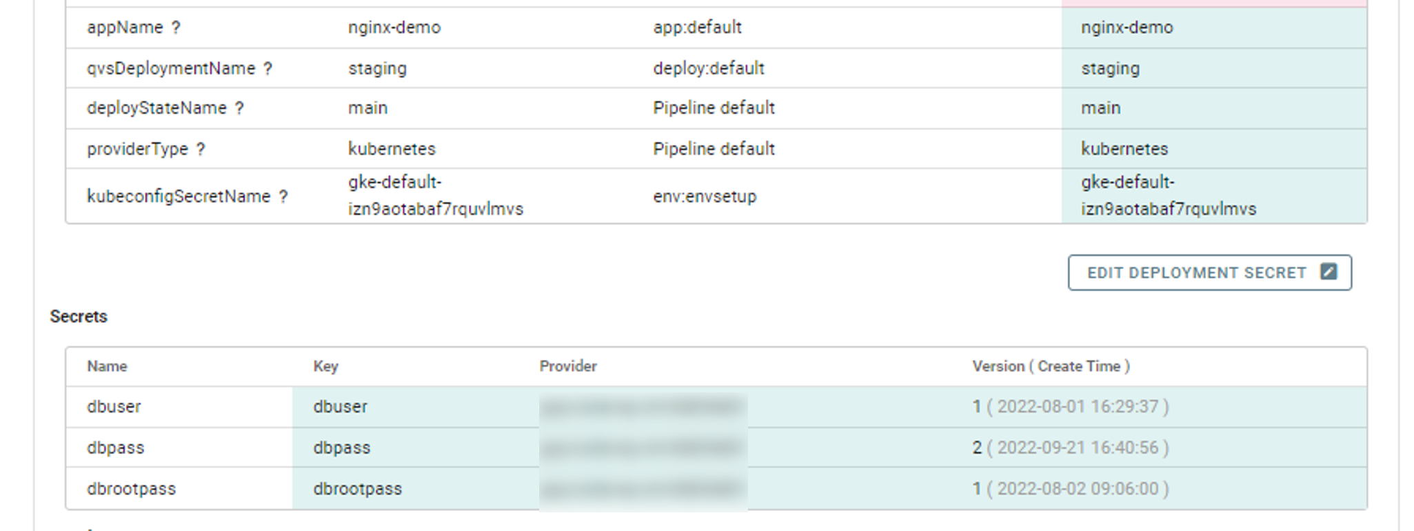 Pipelineの実行時引数として利用する値は、Deployment Secretに機密情報の管理サービスにおいて登録されている機密情報の名前およびそのバージョンを設定することで追加されます。