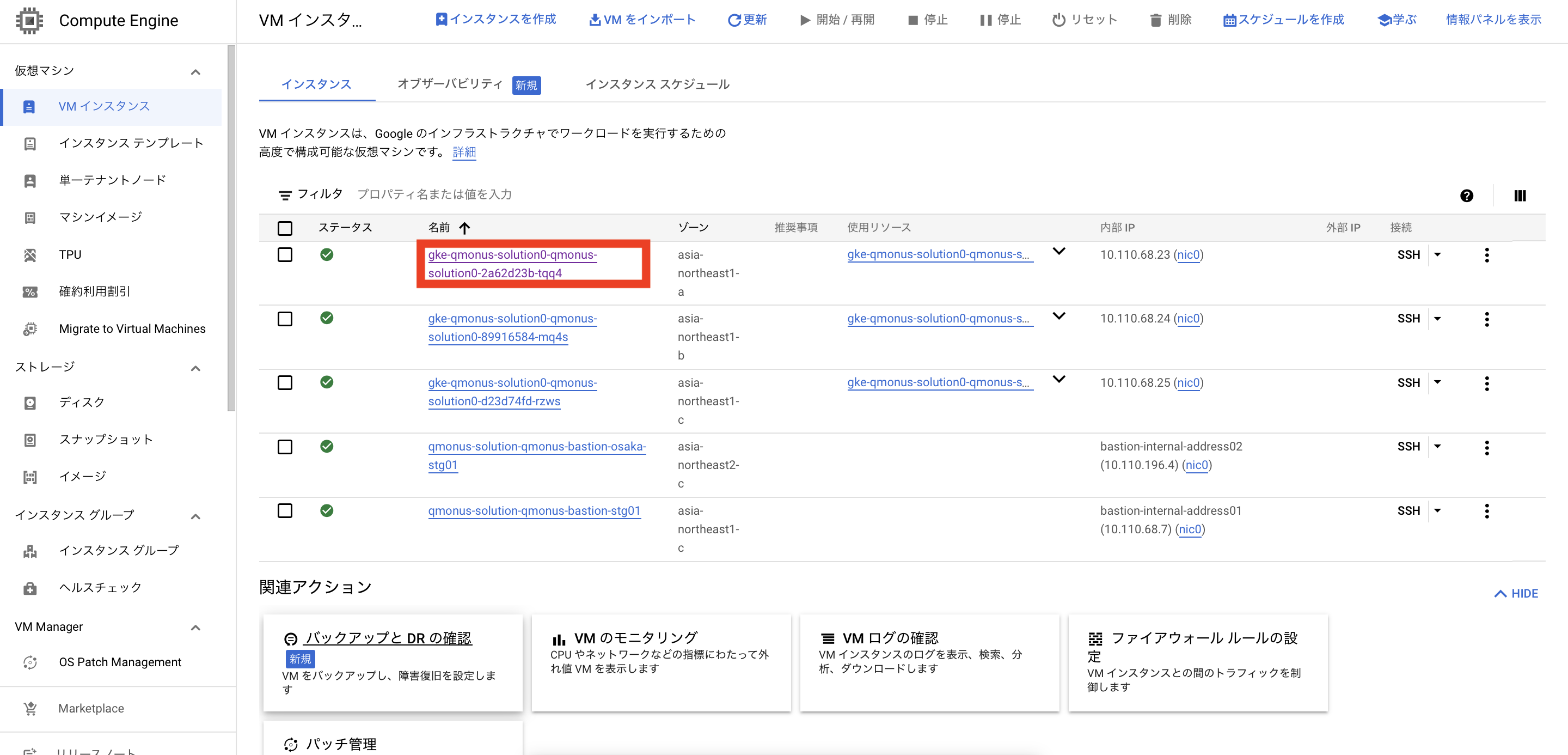 - gke-xxxから始まるインスタンスを選択します。(複数台存在しているのでどれでもよい)