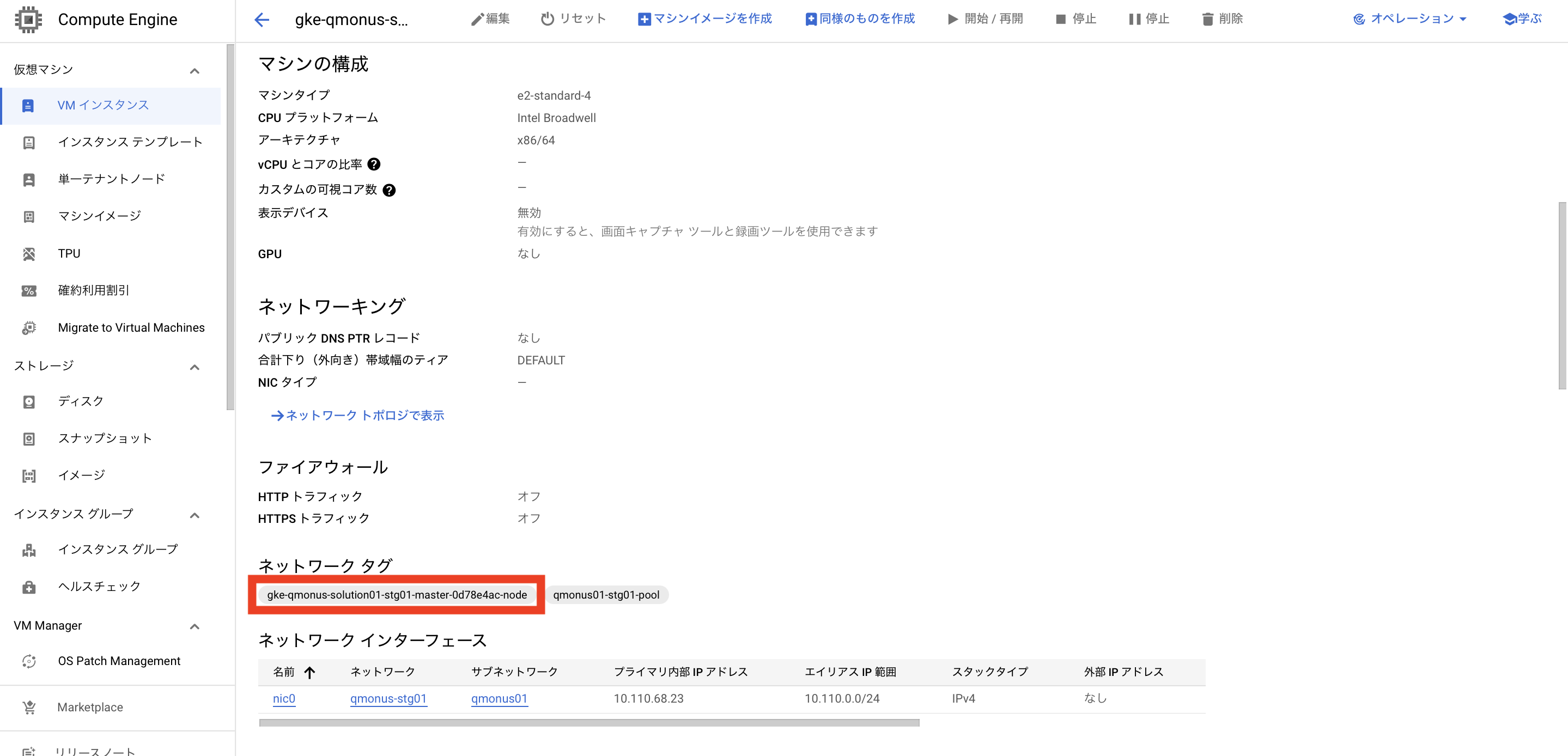 - ネットワークタグに表示されているものが今回利用するtarget_tagsです。(今回だとtarget_tags=gke-qmonus-solution-stg01-master-0d78e4ac-nodeとなる。)