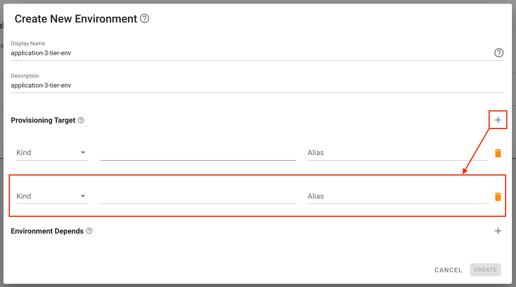 入力項目 入力値 Display Name application-3-tier-envDescription application-3-tier-envProvisioning Target の右側の