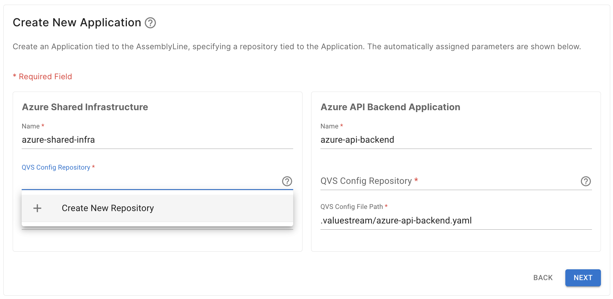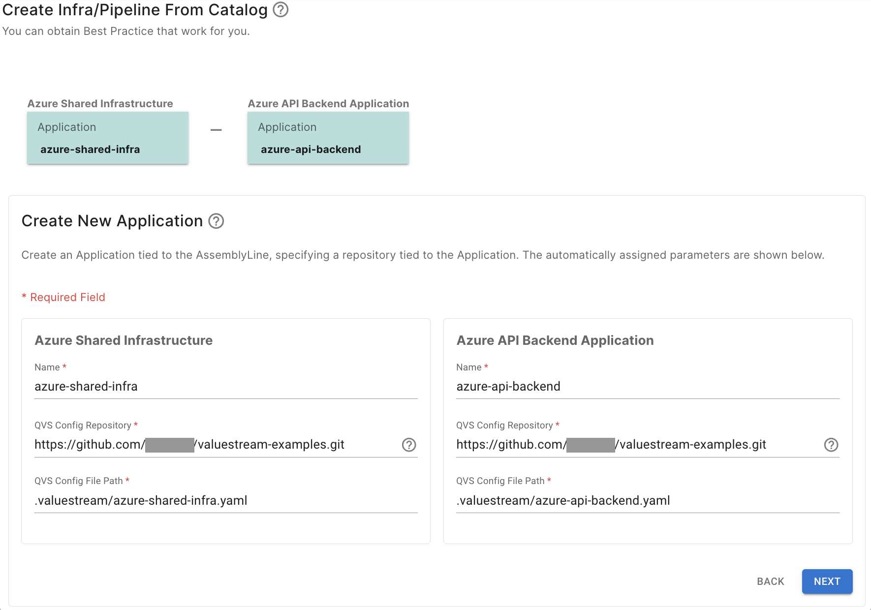 今回のチュートリアルでは Azure Shared Infrastructure と Azure API Backend Application の QVS Config は同一のリポジトリに格納されているため、画面において同一のリポジトリを参照していますが、リポジトリを別に分ける場合はそれぞれのリポジトリを登録し、指定してください。