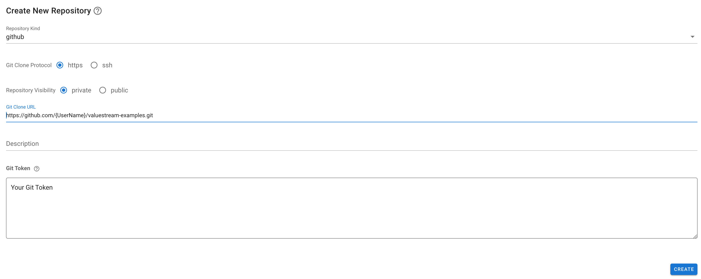 | Git Clone URL | 手順1-1で Forkした プライベートリポジトリのアドレス (https://github.com/{UserName}/valuestream-examples.git) |