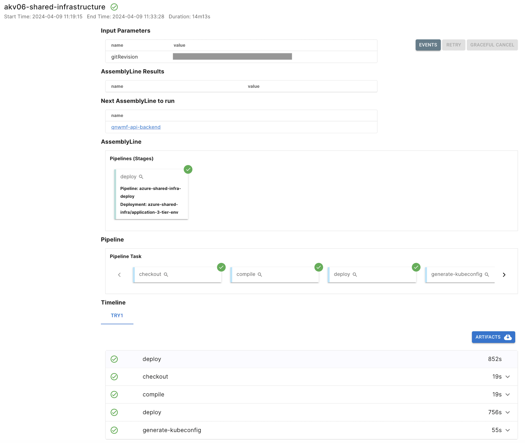 以上で、azure-shared-infra の AssemblyLine に関する作業は完了です。 続いて、azure-api-backend の AssemblyLine を実行して、azure-shared-infra によって作成されたクラウドリソース上に API Backend をデプロイする作業を進めます。