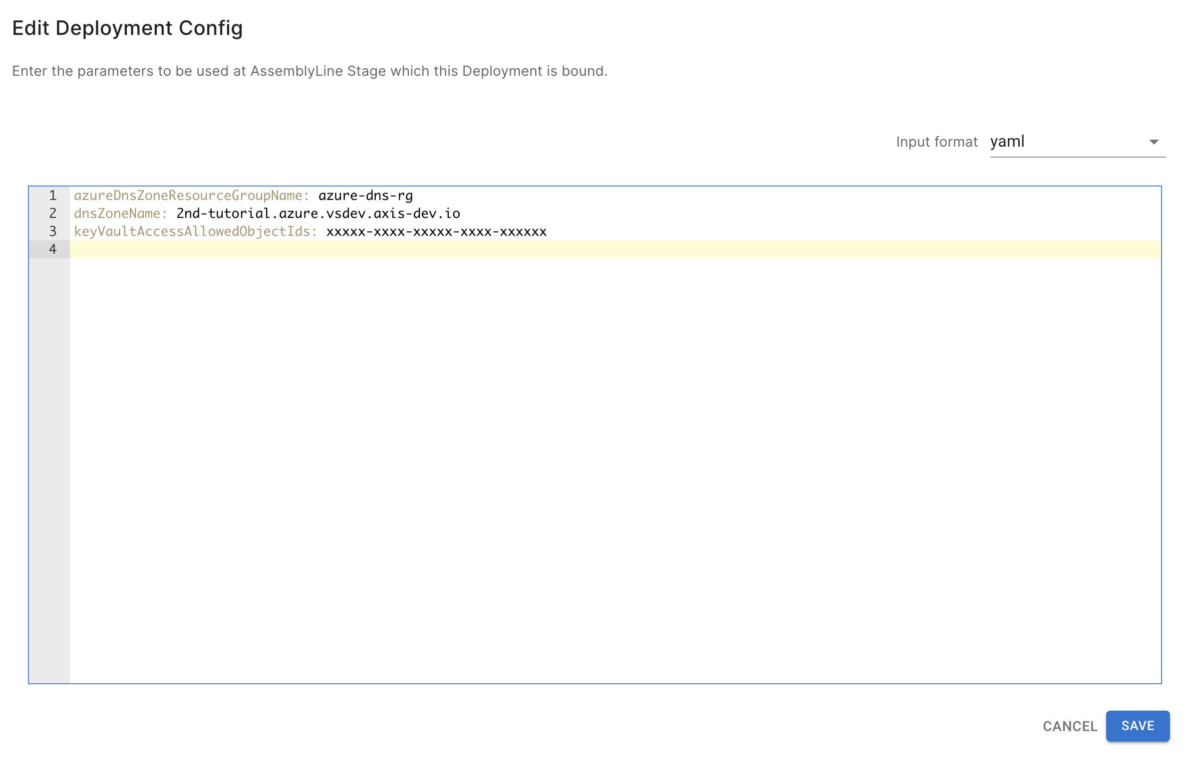 azureDnsZoneName事前準備で作成したDNSゾーン名(例: 2nd-tutorial.azure.vsdev.axis-dev.io)
