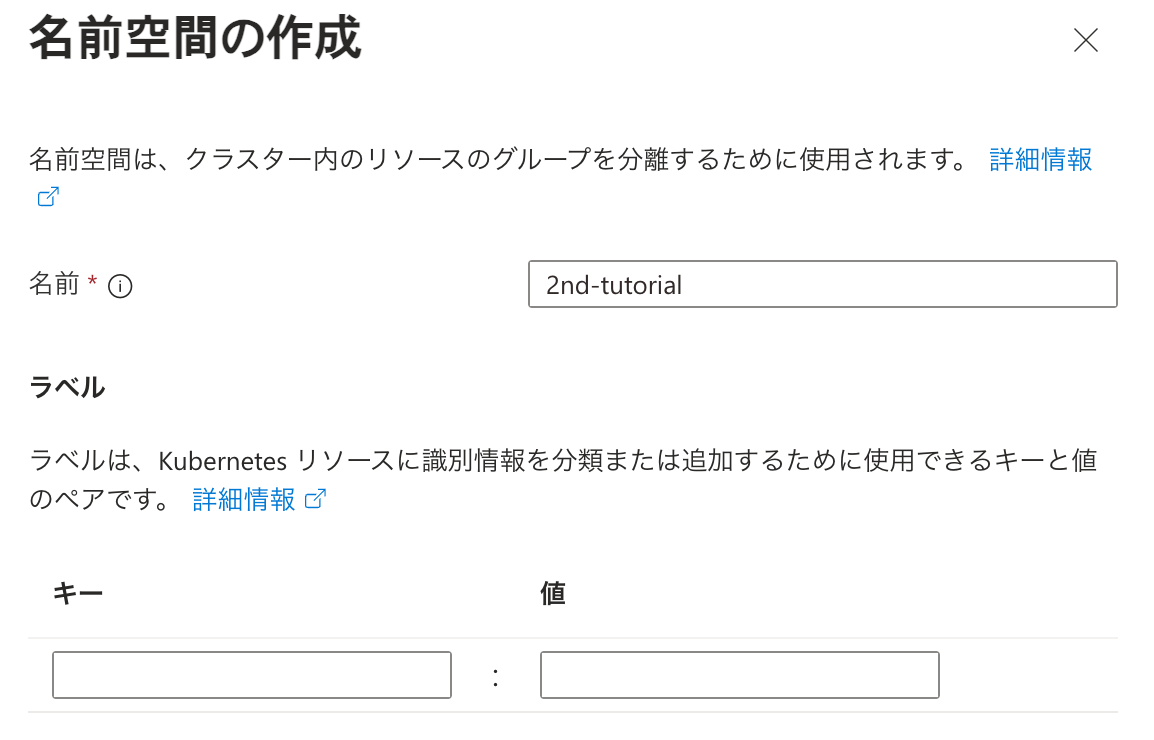 5. 入力画面が表示されたら名前の入力欄に 2nd-tutorial と入力し、OK ボタンをクリックして Namespace を作成します。