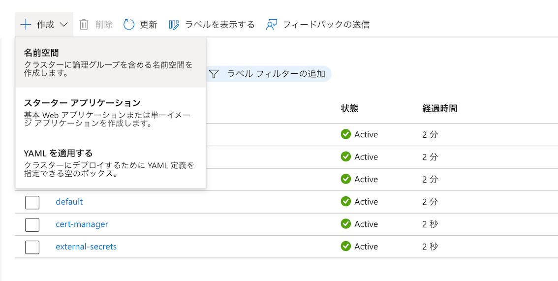 4. 画面上部の + 作成 ボタンをクリックし、名前空間 を選択します。