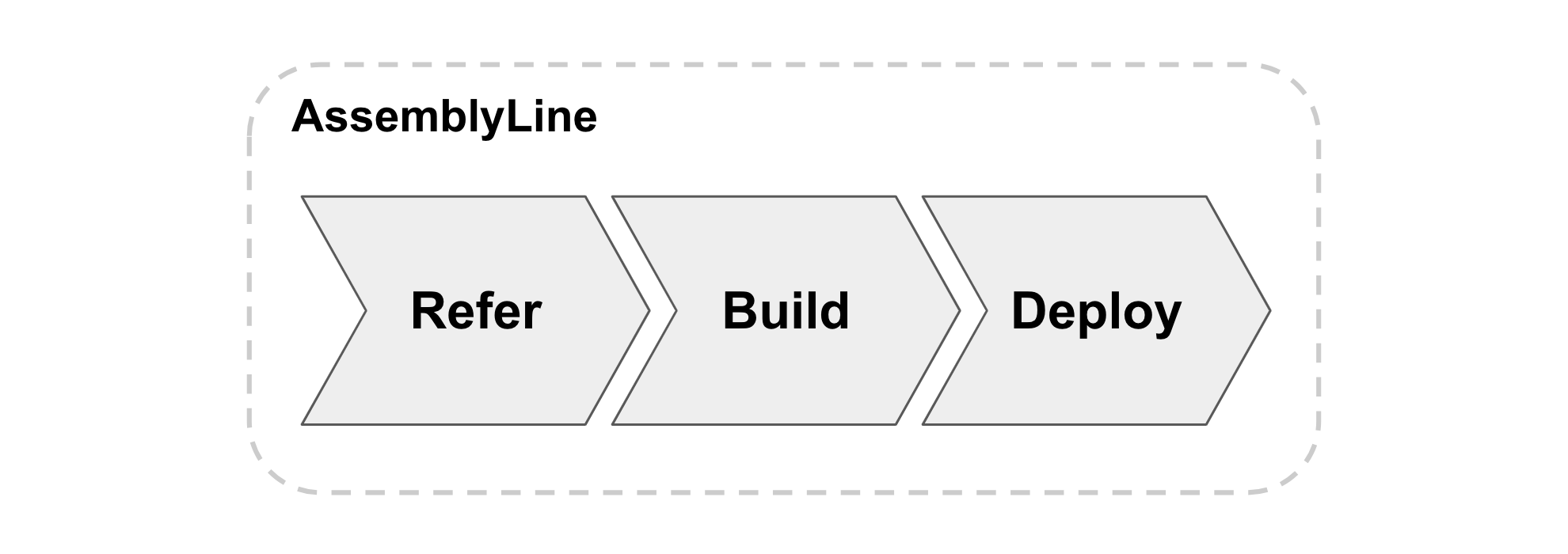 また、Pipeline Stages が refer build deploy の順番で配置されていることに注目してください。このため、この AssemblyLine を実行すると、まず refer Pipeline が実行され、refer Pipeline の実行が完了すると build Pipeline が実行され、build Pipeline の実行が完了すると deploy Pipeline が実行され、deploy Pipeline の実行が完了すると AssemblyLine の実行が完了することになります。
