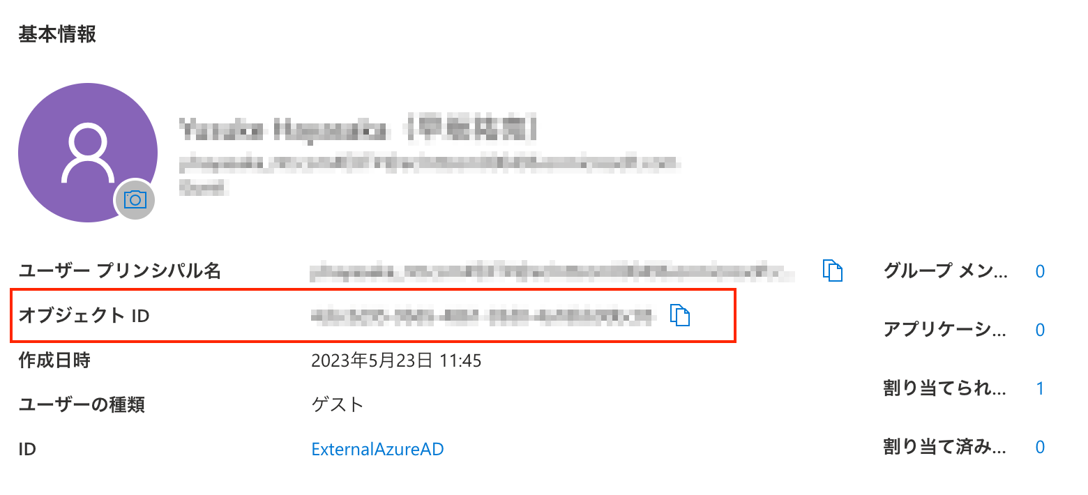 1. ユーザの詳細画面をクリックすると オブジェクトID が表示されるのでコピーしてパラメータに入力します。