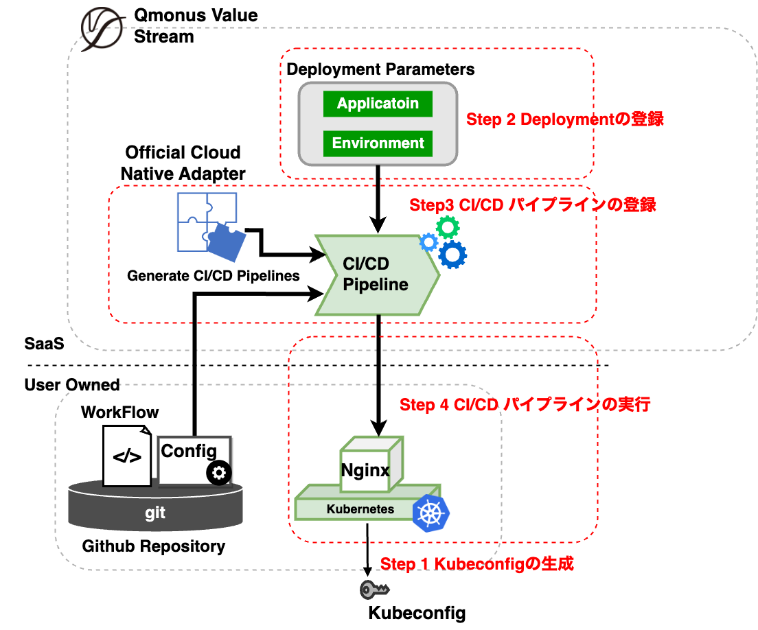 - 最後に Step 4 では、Qmonus Value Stream の CI/CD パイプラインを実行することで、Kubernetes クラスタに Nginx コンテナアプリケーションをデプロイします。