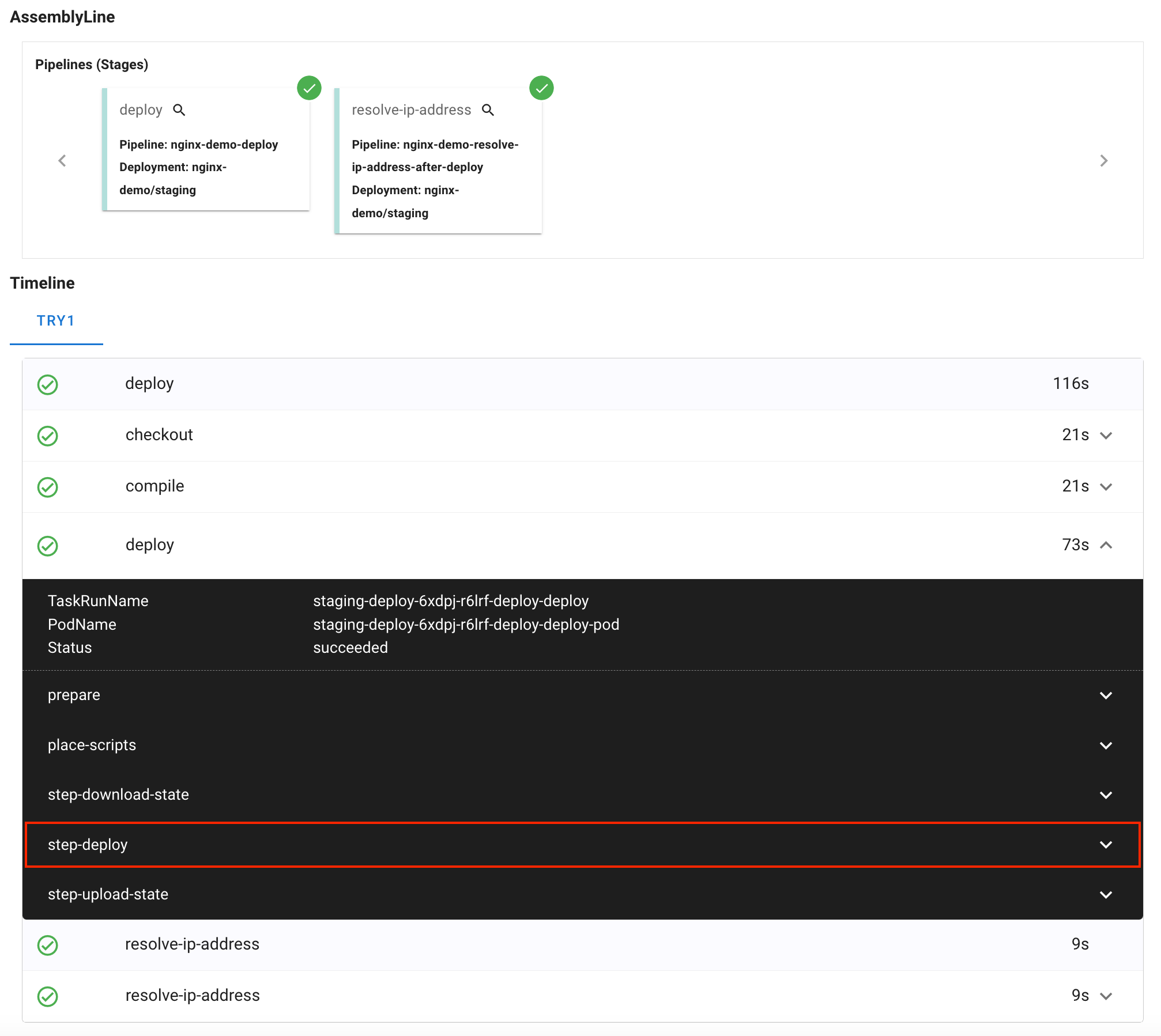 nginx-demo-deployPipelineのdeployTaskのstep-deployStepのAssemblyLine実行ログから、以下のように2つのKubernetesリソース(ServiceおよびDeploymentリソース)が削除されたことを確認できます。