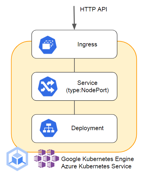 本章で使用するサンプルManifestでデプロイされるアプリケーションは、以下の図に示すように、Kubernetes DeploymentリソースとService(type: NodePort)リソース、Ingressリソースで構成されるHTTP APIサーバです。Getting Started(GCP / Azure)で使用した環境のKubernetesクラスタをお使いください。